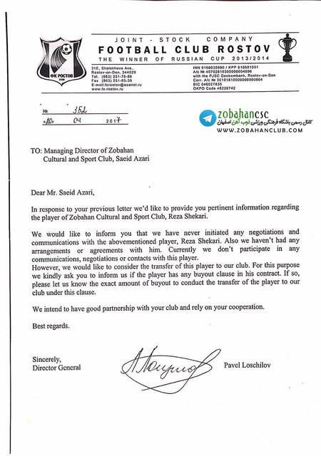 باشگاه روستوف در نامه‌ای رسمی به ذوب‌آهن، خواهان به خدمت گرفتن رضا شکاری شد.