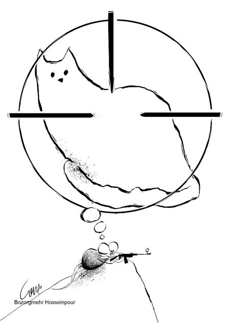 بزرگمهر حسین پور کاریکاتوریست و کارگردان انیمیشن پوستری طراحی کرد و زیر آن نوشت: موشی به "خیال" شکار گربه میکرد!