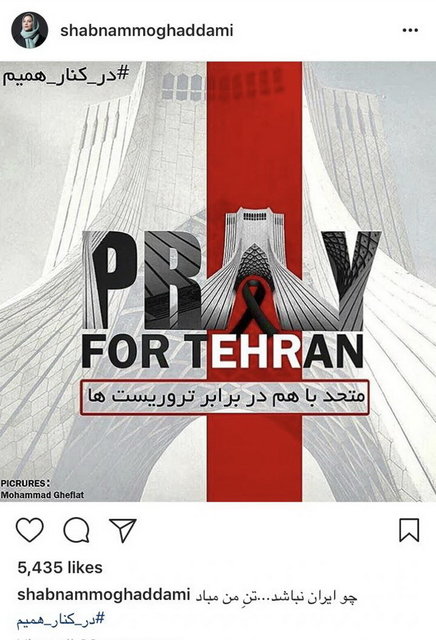 مهناز افشار- بازیگر با انتشار عکسی از میدان آزادی که روی آن نوشته شده برای تهران دعا کنید نوشت: بعد از حمله به کابل نوشتم این حمله به کابل نیست بلکه حمله به انسانیت است. امروز، ترس و اضطراب قلبهای بسیاری از هموطنانم را فراگرفته و من نیز مانند آنها نگرانم اما ما کنار هم ایستادیم و بدانید کنار هم قویتر هستیم. وظیفه خود میدانم به مردم ایران و به خصوص خانواده عزیزانی که در این حملات تروریستی جانشان را از دست دادند تسلیت بگویم.