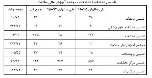 به گزارش وبدا، عملکرد چهارساله وزارت بهداشت در حوزه تاسیس دانشگاه، دانشکده، مجتمع آموزش عالی سلامت نیز به شرح زیر بوده است: