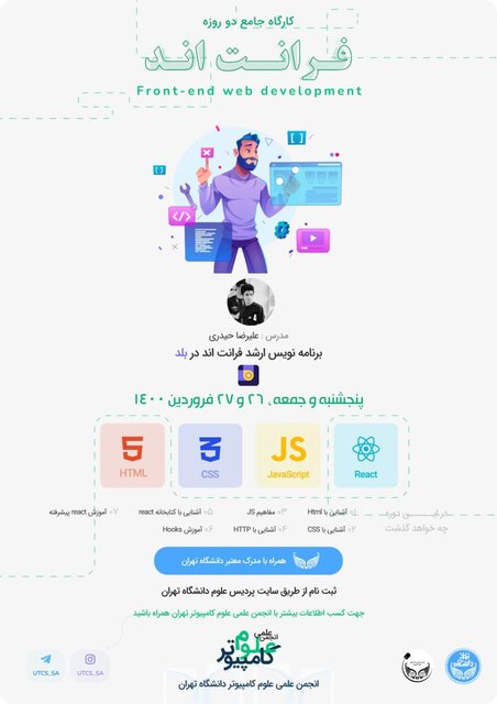 این کارگاه با تدریس علیرضا حیدری ـ توسعه دهنده ارشد و برنامه نویس فرانتاند، روز پنجشنبه و جمعه ۲۶ و ۲۷ فروردین از ساعت ۱۴ الی ۲۰ برگزار می شود.