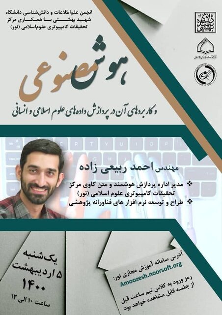 به گزارش باشگاه دانشجویان ایسنا، این برنامه با حضور و ارائه مهندس احمد ربیعی زاده ـ مدیر اداره پردازش هوشمند و متن کاوی مرکز تحقیقات کامپیوتری علوم اسلامی(نور)، روز یکشنبه پنجم اردیبهشت ۱۴۰۰، ساعت ۱۰ تا ۱۲، به صورت آنلاین برگزار می شود.