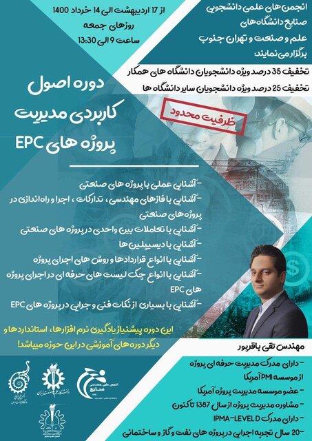 به گزارش باشگاه دانشجویان ایسنا، "آشنایی عملی با پروژه های صنعتی"، "آشنایی با فازهای مهندسی، تدرکات، اجرا و راهاندازی در پروژههای صنعتی"، "آشنایی با تعاملات بین واحدی در پروژههای صنعتی"، "آشنایی با دیسیپلینها"، "آشنایی با انواع قرارها و روشهای اجرای پروژه"، "آشنایی با انواع چک لیستهای حرفه ای در اجرای پروژههای EPC" و"آشنایی با بسیاری از نکات فنی و جدایی در پروژههای EPC" از جمله مباحث و سرفصل هایی است که در این دوره ارائه می شود.