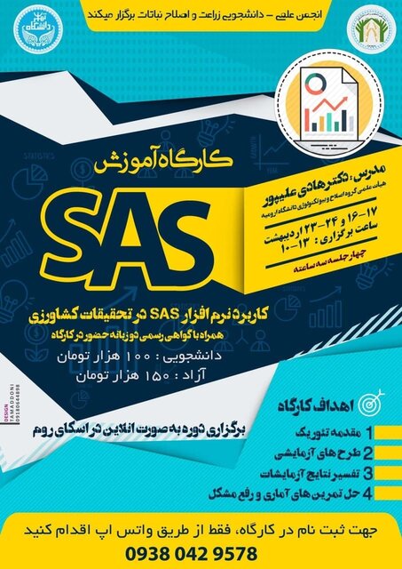 به گزارش باشگاه دانشجویان ایسنا، "تئوری و مقدمات SAS"، "طرح های آزمایشی در تحقیقات کشاورزی"، "تفسیر کامل نتایج آزمایشهای آنالیز شده" و "حل تمرین آماری و رفع مشکل آنالیز های انجام شده" از جمله مباحث و سرفصلهایی است که در این برنامه آموزش داده می شود.