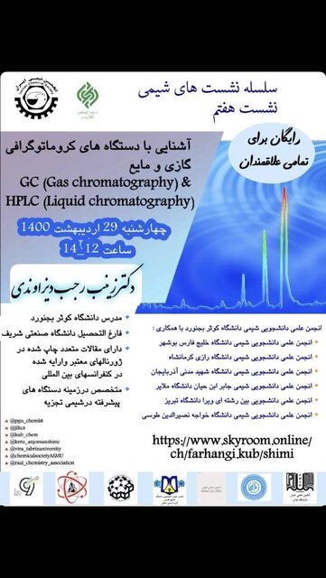 نشست آشنایی با دستگاه های کروماتوگرافی گازی و مایع، با حضور و ارائه دکتر زینب رجب دیزاوندی ـ استاد دانشگاه کوثر بجنورد و متخصص در زمینه دستگاه های پیشرفته در شیمی تجزیه، روز چهارشنبه ۲۹ اردیبهشت ساعت ۱۲ الی ۱۴، به صورت مجازی در لینک https://www.skyroom.online/ch/farhangi.kub/shimi برگزار میشود.