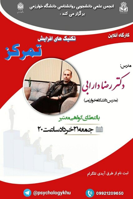 کارگاه آموزش تکنیکهای افزایش تمرکز، با تدریس دکتر رضا دارابی ـ مدرس دانشگاه خوارزمی، روز جمعه ۲۱ خرداد ساعت ۲۰ به صورت آنلاین برگزار میشود.