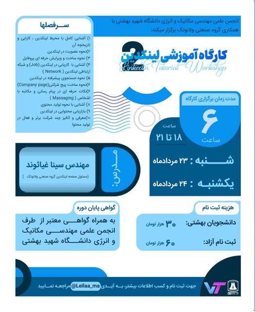 علاقهمندان می توانند جهت ثبت نام و کسب اطلاعات بیشتر به شناسه leilaa_ma @ مراجعه کنند.