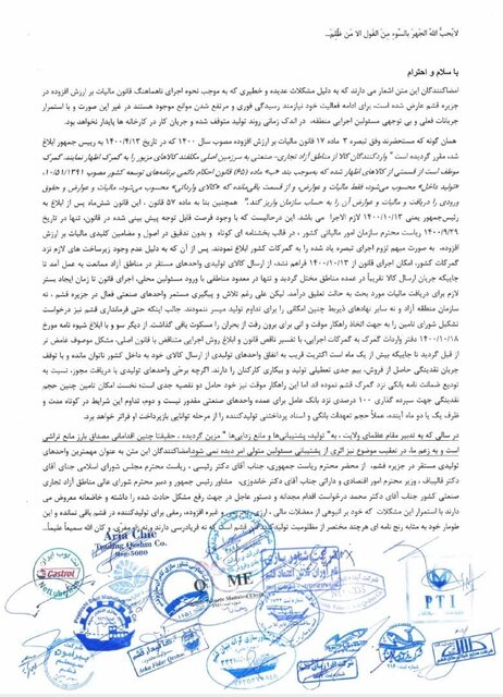تولید کنندگان در پایان هم با بیان اینکه در سالی که به تدبیر مقام معظم رهبری، به" تولید، پشتیبانیها و مانع زداییها " مزین شده، حقیقتا چنین اقدامانی مصداق بارز مانع تراشی است و به زعم ما، در تعقیب موضوع نیز اثری از پشتیبانی مسئولین متولی امر دیده نمیشود، از رئیس جمهوری، رئیس مجلس شورای اسلامی، وزیر امور اقتصادی و دارائی، مشاور رئیس جمهوری و دبیر شورای عالی مناطق آزاد تجاری صنعتی کشور درخواست اقدام مجدانه و دستور عاجل جهت رفع مشکل حادث شده را داشتند.