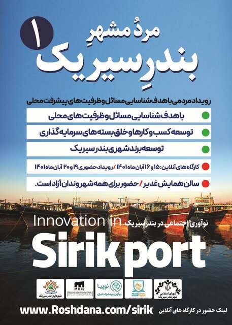 زرهی زاده تصریح کرد: رویداد مردمشهر بندر سیریک، در راستای ایجاد زیست بوم نوآوری اجتماعی با کمک شهروندان خلاق توسط استودیو نوآوری شهری شتابدهنده ماموت (MUIS) و با حمایت شهرداری و شورای اسلامی از ۱۵ آبانماه آغاز و شامگاه جمعه ۲۰ آبانماه به کار خود پایان داد.