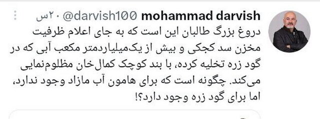 محمد درویش_ فعال محیط زیست_ نیز در توییتر خود درباره پرداخت حقآبه هیرمند توسط طالبان نوشته است: «دروغ بزرگ طالبان این است که به جای اعلام ظرفیت مخزن سد کجکی و بیش از یکمیلیارد متر مکعب آبی که در گود زره تخلیه کرده، با بند کوچک کمالخان مظلومنمایی میکند. چگونه است که برای هامون آب مازاد وجود ندارد، اما برای گود زره وجود دارد؟!»