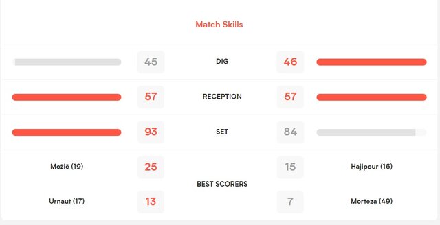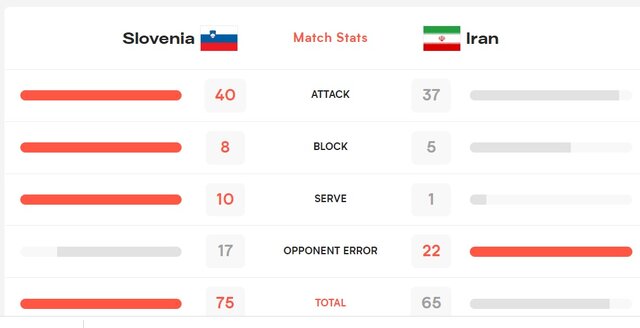 در این بازی اسلوونی در حمله تیم برتر بود به طوری که ۴۰ امتیاز از این بخش کسب کرد درحالی که تیم ملی والیبال ایران در حمله ۳۷ امتیاز به دست آورد.