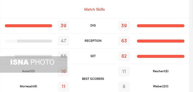 در این رقابت، امین اسماعیل‌نژاد، ملی‌پوش والیبال ایران درخشید و توانست ۱۶ امتیاز به دست بیاورد تا بهترین بازیکن ایران و زمین نام بگیرد. مرتضی شریفی دیگر ملی‌پوش والیبال ایران در این بازی ۱۱ امتیاز کسب کرد تا دومین بازیکن ایران از نظر امتیازآوری باشد.