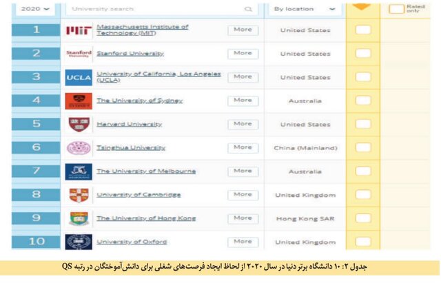دانشگاه های برتر دنیا در سال ۲۰۲۰ از لحاظ ایجاد فرصتهای شغلی برای دانشآموختگان در رتبه QS