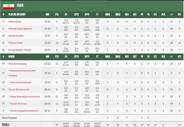 فائزه شهریاری، معصومه اسماعیلزاده، آیدا گلمحمدی، نگین رسولیپور و شیدا شجاعی در ترکیب ابتدایی ایران قرار داشتند.