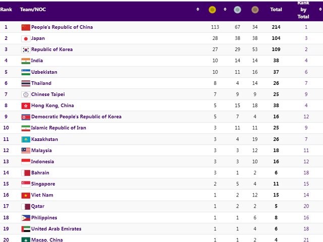 جدول مدالی در روز هفتم بازیهای آسیایی هانگژو: