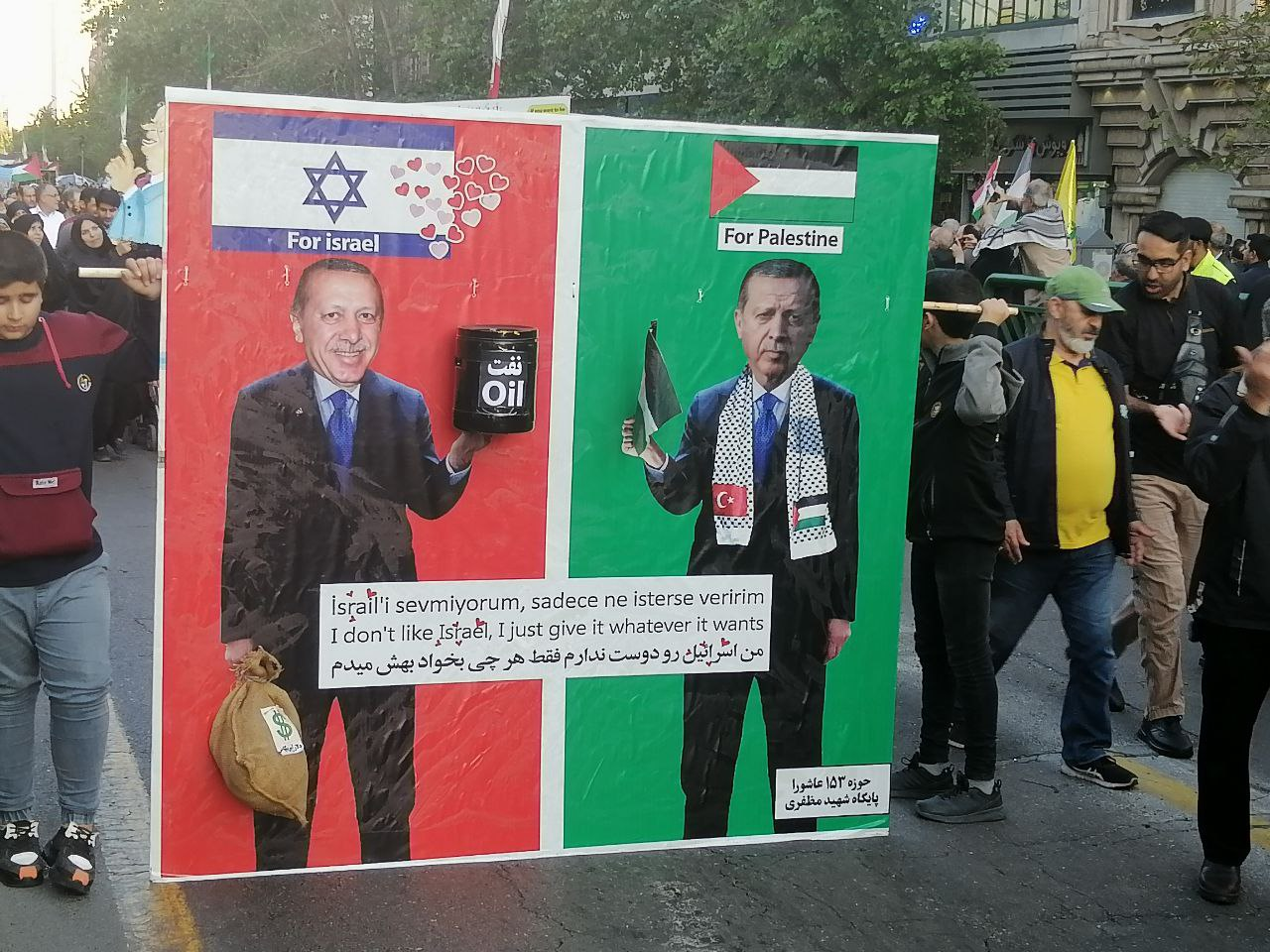 راهپیمایان تهرانی همچنین با در دست داشتن بنرهایی حاوی کاریکاتور اردوغان انزجار خود را از آنچه از نظر آنها سیاست های دوگانه رییس جمهور ترکیه در قبال رژیم صهیونیستی بود را اعلام کردند.