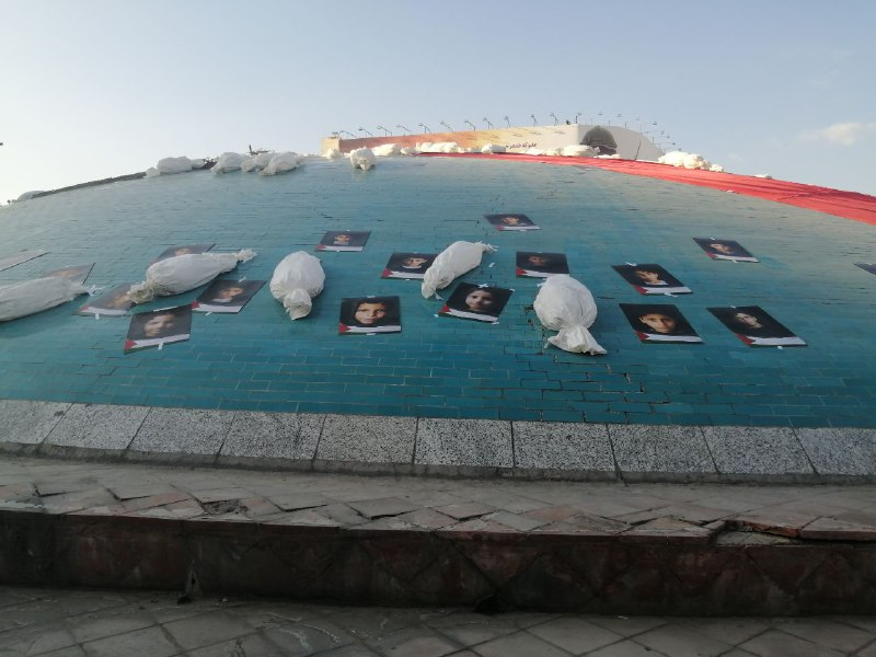 در میدان انقلاب که به مقصد این راهپیمایی بود به صورت نمادین تصاویر پیکرهای کودکان غزه نصب شده بود.