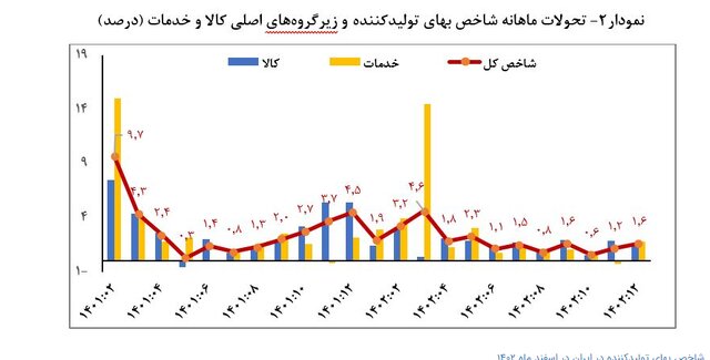 در همین ارتباط، تورم ماهانه شاخص بهای تولیدکننده در اسفندماه ۱۴۰۲ رقم ۱.۶ درصد را ثبت نمود. بررسی تورم ماهانه به تفکیک گروه‌های اختصاصی «کالا» و «خدمت» نیز حاکی از تحقق تورم ۱.۵ درصدی گروه کالا (ضریب اهمیت ۶۵.۷ درصد) با سهم از تورم ۱.۰ واحد درصد و تورم ۱.۸ درصدی خدمات (ضریب اهمیت ۳۴.۳ درصد) با سهم از تورم ۰.۶ واحد درصد است.