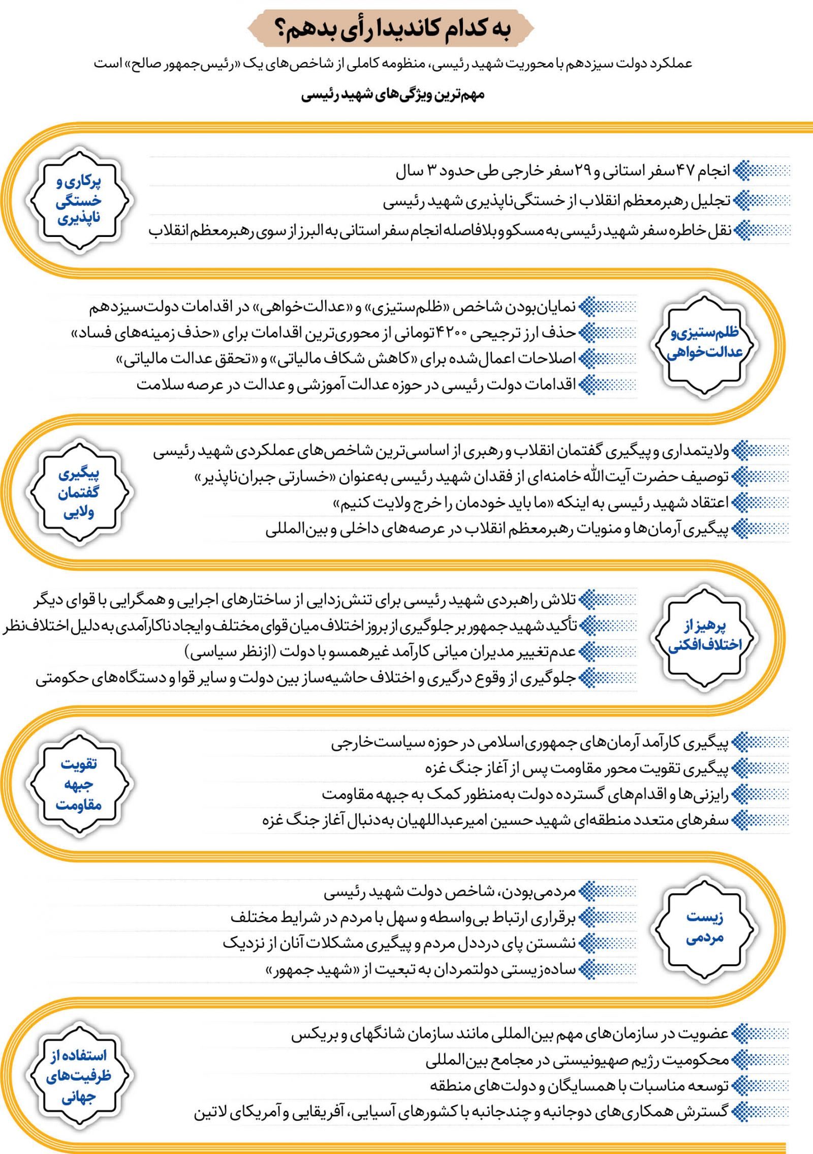 در شرایطی که ادامه راه روشن شهیدرئیسی به یکی از محوریترین مطالبات جامعه از دولت چهاردهم تبدیل شدهاست، یکی از الزامهای اساسی چنین مطالبهای، تطبیق ویژگیهای کاندیداها با الگوی «شهید جمهور» ازسوی رایدهندگان است؛ الگویی که میتواند راهگشای بسیاری از مشکلات و چالشهای پیشروی جامعه باشد. در ادامه به بررسی زوایای مختلف آن میپردازیم.