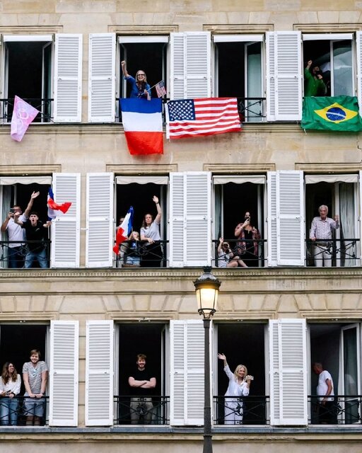 خیلی از مردم فرانسه از بالکن منازلشان در حال تماشای مراسم افتتاحیه هستند.