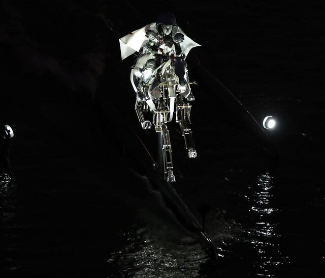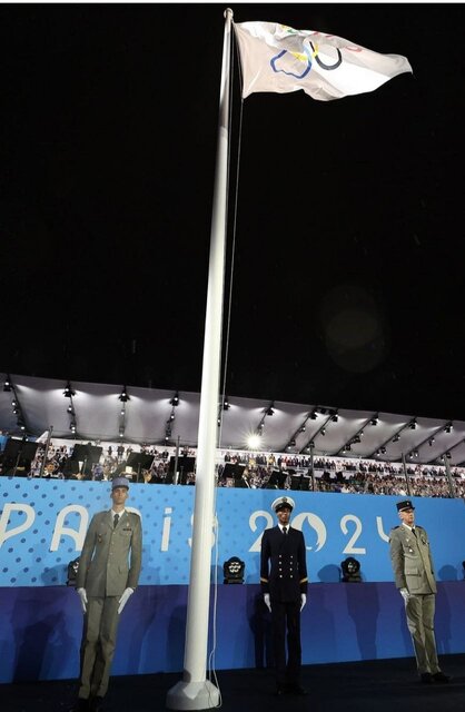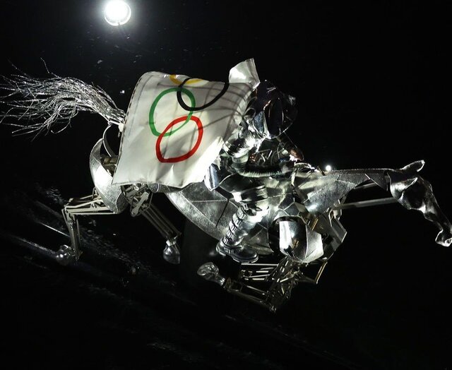 پرچم کمیته بین المللی المپیک که تصویری از پنج حلقه المپیک است، توسط فردی که صورت او نامشخص بود حمل شد. این شخص سوار بر اسب آهنین مسیر رودخانه سن را طی کرد و پرچم را محلی برد که باید به اهتزاز در میآمد.
