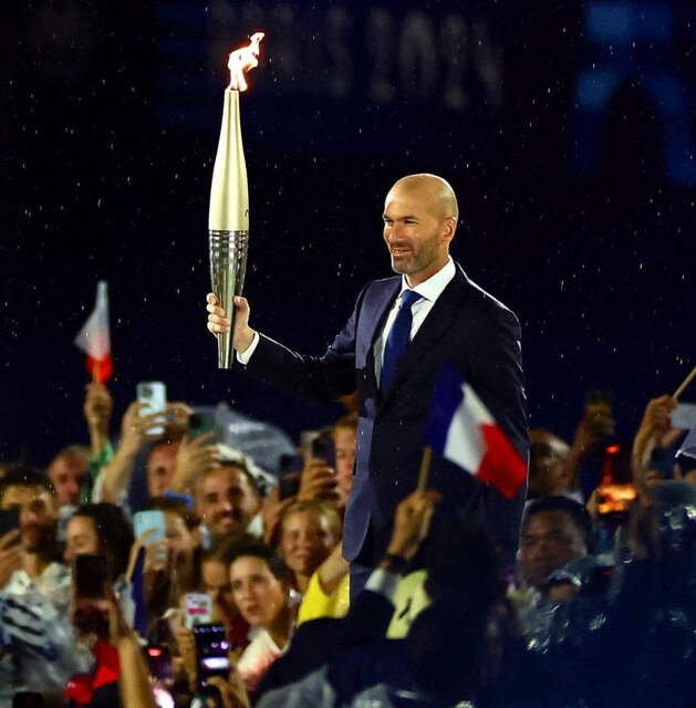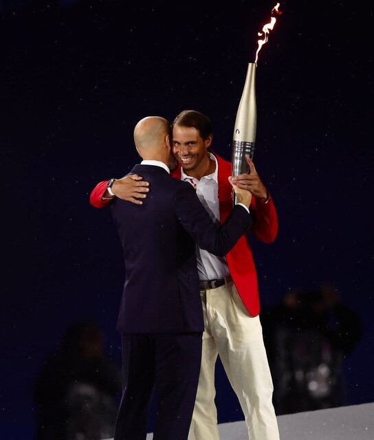 فردی که چهره نامشخصی داشت، مشعل المپیک ۲۰۲۴ پاریس را به زیدان اسطوره فوتبال فرانسه تحویل داد. زیدان هم مشعل را به رافائل نادال داد و او را در آغوش گرفت.