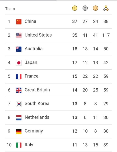 در المپیک ۲۰۲۰ توکیو ایالات متحده با ۳۹ طلا، چین با ۳۸ طلا و ژاپن با ۲۷ طلا اول تا سوم شدند.