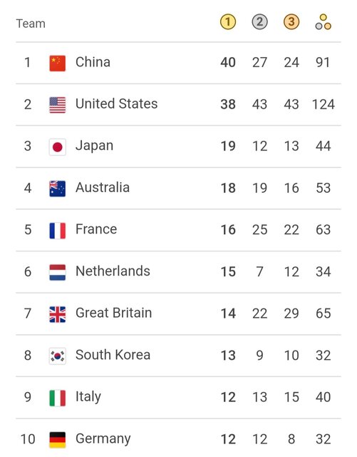 در المپیک ۲۰۲۰ توکیو ایالات متحده با ۳۹ طلا، چین با ۳۸ طلا و ژاپن با ۲۷ طلا اول تا سوم شدند.