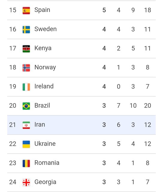 به گزارش ایسنا، در شانزدهمین و آخرین روز از سیوسومین دوره بازیهای المپیک ۲۰۲۴ پاریس، ایران با سه مدال طلا، شش نقره و سه برنز در رده بیست و یکم قرار دارد.