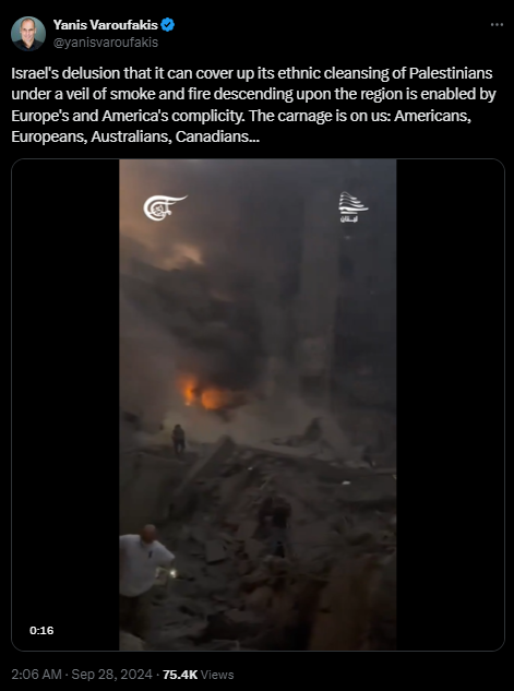 اما چند نفر در غرب این حمله اسرائیل به بیروت را محکوم خواهد کرد؟ چه کسی میداند که امروز چند غیرنظامی توسط اسرائیل در بیروت کشته شدند. ساختمانهای مسکونی مملو از خانوادهها نابود شدهاند. این توحش است.»