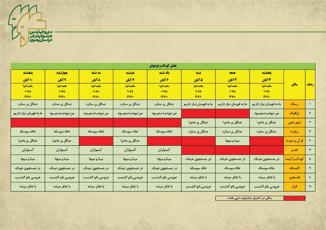 اجراهای بخش کودک و نوجوان سی‌و چهارمین جشنواره تئاتر خراسان رضوی از روز پنجشنبه ۳ آبان ماه آغاز می‌شود و تا ۱۰ آبان ماه نیز ادامه دارد.