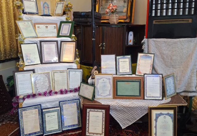 دختری چادری به سمت قسمتی که پر از لوح و تقدیرنامه بود میآید. به او آنها را نشان میدهم و کنجکاوم تا بیشتر از پایگاه بسیج میرآقا برایم بگوید، او به سمتی میرود و تقدیرنامههای متعددی را در دست میگیرد و افتخاراتی که کسب کرده را به من نشان میدهد.