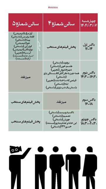 باکس­‌های اکران آثار، از روز شنبه تا چهارشنبه، ۳ الی ۷ خرداد ۱۴۰۴، از ساعت ۱۲ الی ۲۱ در پردیس سینمایی چارسو برگزار خواهد شد.