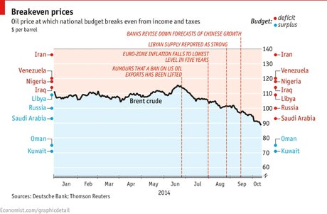 به گزارش خبرگزاری دانشجویان ایران(ایسنا)، به نقل از پایگاه خبری ووکس، این مساله تا چقدر ناخوشایند است. نقطه مناسب برای شروع این مقاله نمودار نشریه اکنومیست است که در آن قیمت مناسب نفت برای متعادل کردن بودجه کشورهای تولیدکننده قید شده است.