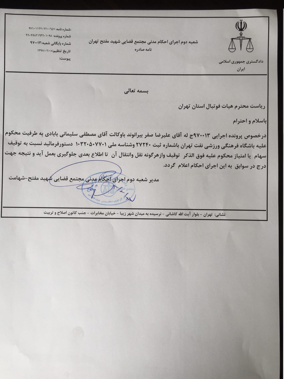 پیش از این بیرانوند توانسته بود حکم توقیف اموال نفت را دریافت کند.