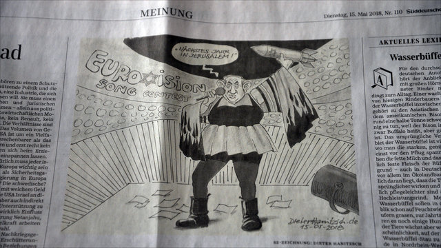 این کاریکاتوریست آلمانی در اثر اخیر خود نتانیاهو را به جای برنده واقعی جایزه خوانندگی اروپا در حالی که گوشهای بزرگی دارد و موشکی با شکل ستاره معروف داوود در دست او است ترسیم کرد. در این کاریکاتور بالای سر نتانیاهو به نقل از وی نوشته شده است: "در سال آتی در قدس".