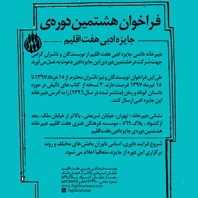 نشانی دبیرخانه جایزه به این شرح است: تهران، خیابان شریعتی ، بالاتر از خیابان ملک، بعد از کشواد، پلاک ۵۶۹، موسسه فرهنگی هنری هفت اقلیم، دبیرخانه هشتمین دوره جایزه ادبی هفت اقلیم.