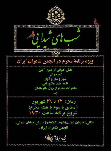 «شب‌های شیدایی» از پنجشنبه بیست و دوم شهریورماه مطابق با سوم محرم به مدت پنج شب در انجمن شاعران به نشانی خیابان شریعتی، خیابان کلاهدوز (دولت)، نبش کوچه نعمتی برگزار می‌شود.