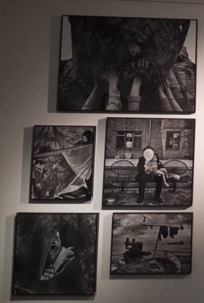 از بخش طبیعت نمایشگاه که عبور کنیم میتوانیم عکسهای صحنهآرایی شده را ببینیم. تصاویری که شاید هنرمند صحنه را با منظور و هدف خاصی چیده و در نهایت عکس کنونی را به ثبت رسانده باشد. این بخش از تصاویر نیز دوباره فضایی سرد و سیاه و سفید دارند. باز هم میتوان فضایی حزنانگیز را در آثار مشاهده کرد. باوجود اینکه آثار دارای تنوع و موضوعات مختلف هستند ولی رنگ و رویشان، آنها را به هم مرتبط میسازد. یک جا تنهایی به تصویر کشیده شده و یک جا بیهویتی و نیستی.