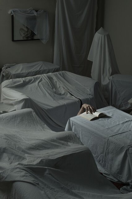 درست در سمت چپ این اثر باز هم تصویری را میبینیم که سراسر ملافههای سفید روی مبلها کشیده شده است. از پایین میز، دستی را میبینیم که روی یک کتاب قرار دارد. این بار نیز هویت مشخصی در عکس وجود ندارد. همه چیز، مبل، میز، تابلو و ... با پارچههای سفید پوشانده شدهاند. گویی که دیگر نباید خاطرهای از این فضا به یاد بماند.