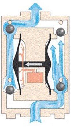پمپ دیافراگمی از خانواده پمپهای جابهجایی مثبت بوده که با حرکت رفت و برگشت پیستون در یک طرف محفظه، دیافراگم رو به عقب رفته که باعث افت فشار شده و سیال را به درون محفظه مکش کرده و در طرف دیگر دیافراگم به سمت پوسته پمپ حرکت کرده که تراکم ایجاد شده باعث ایجاد فشار میشود در نتیجه سیالی با فشار بالا به سمت خروجی هدایت میشود.