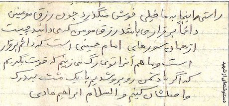 آمدم جلو و گفتم: مادر چی شده؟، گفت:من بوی ابراهیم رو حس میکنم. ابراهیم الآن توی این اتاقه، همینجا و..وقتی گریهاش کمتر شد گفت:من مطمئن هستم که ابراهیم شهید شده است. ابراهیم دفعه آخر خیلی با دفعات دیگه فرق کرده بود، هر چی به او گفتم: بیا برایت به خواستگاری برویم میگفت: نه مادر، من مطمئنم که برنمیگردم. نمیخواهم چشم گریانی گوشه خانه منتظر من باشد.چند روز بعد مادر دوباره جلوی عکس ابراهیم ایستاده بود و گریه میکرد. ما هم بالاخره مجبور شدیم از دایی بخواهیم به مادر حقیقت رو را بگوید. آن روز حال مادر به هم خورد و ناراحتی قلبی او شدید شد و در سی. سی. یو بیمارستان بستری شد.»