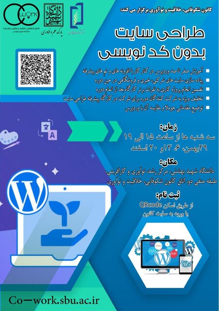 دوره آموزشی طراحی سایت بدون کدنویسی، روزهای سه شنبه ۲۹ بهمن و ۶ و ۱۳ و ۲۰ اسفند ، ساعت ۱۵ الی ۱۹، در دانشگاه شهید بهشتی، مرکز رشد، اتاق کانون شکوفایی، خلاقیت و نوآوری برگزار میشود.