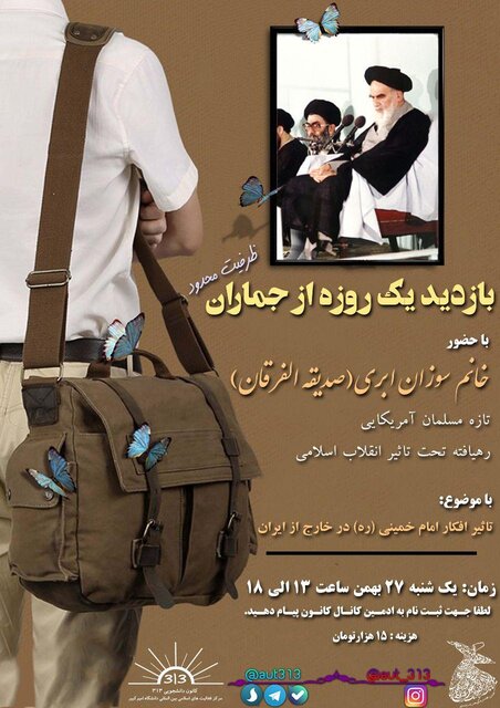 به گزارش باشگاه دانشجویان ایسنا، این بازدید با حضور خانم سوزان ابری (صدیقه الفرقان) ـ تازه مسلمان آمریکایی و رهیافته تحت تاثیر انقلاب اسلامی و با موضوع تاثیر افکار امام خمینی (ره) در خارج از ایران روز یکشنبه ۲۷ بهمن ساعت ۱۳ الی ۱۸ انجام خواهد شد.