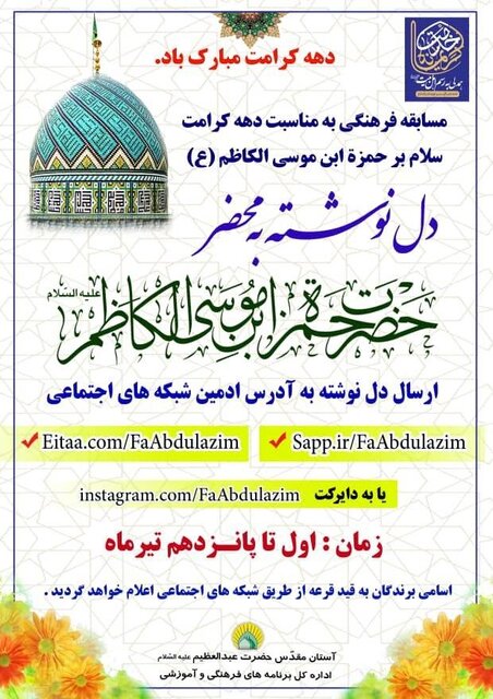 معاون فرهنگی آستان مقدس حضرت عبدالعظیم حسنی(ع) ادامه داد: یک مسابقه فرهنگی دل ‌نوشته نیز به حضرت حمزه بن موسی الکاظم(ع) از طریق شبکه‌های اجتماعی از ابتدا تا ۱۵ ذی‌القعده برگزار خواهد شد، همچنین موارد مرتبط با دهه کرامت شامل احادیث منتخب تحت عنوان «احادیث روز» عرض ارادت و منبر تصویری در پنج شبکه اجتماعی اجرا خواهد شد.