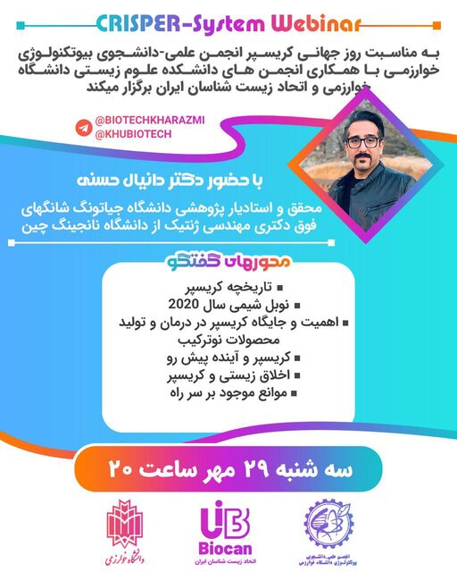 انجمن علمی ـ دانشجویی بیوتکنولوژی خوارزمی با همکاری انجمن‌های دانشکده علوم زیستی دانشگاه خوارزمی و اتحاد زیست شناسان ایران، وبینار CRISPER- System را برگزار می‌کند.