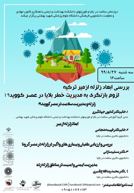 به گزارش باشگاه دانشجویان ایسنا، "زلزله و مدیریت سلامت در عصر کووید۱۹"، "ابعاد زلزله ازمیر"، "بررسی و ارزیابی طغیان و بیماری های واگیر در زلزله در عصر کرونا" و "مدیریت ایمنی و امنیت در مناطق زلزله زده" از جمله مباحث و محورهای این وبینار است که با ارائه و سخنرانی کتایون جهانگیری ـ مدیر گروه آموزشی سلامت در بلایا و فوریت های دانشکده بهداشت و ایمنی دانشگاه علوم پزشکی شهید بهشتی، فهیمه شجاعی، مسلم سارانی و محمدرضا فلاح قنبری دانشجویان دکترای سلامت در بلایا، روز سهشنبه ۲۷ آبان ماه ۹۹ ساعت ۱۶ برگزار می شود.