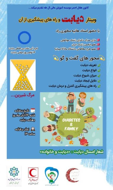 این وبینار، با حضور دکتر هانیه مطهری راد از دانشگاه مالاگا اسپانیا، ۲۴ آبان ساعت ۱۳ همزمان با روز جهانی دیابت در بستر اسکای روم برگزار می شود.