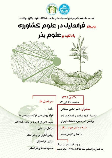 این کارگاه با سخنرانی آقای دکتر الیاس سلطانی ـ دانشیار گروه زراعت و اصلاح نباتات پردیس ابوریحان دانشگاه تهران روز شنبه ۲۰ دی ماه ساعت ۱۱ الی ۱۲ به صورت مجازی برگزار می شود.