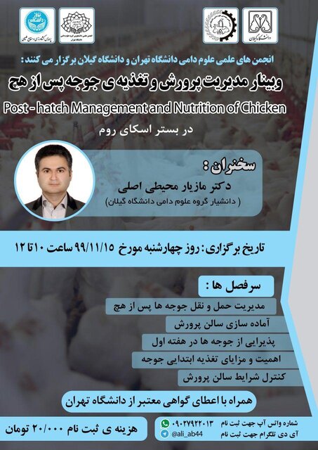 این دوره با تدریس دکتر مازیار محیطی اصلی ـ متخصص تغذیه طیور و دانشیار گروه علوم دامی دانشگاه گیلان، روز چهارشنبه ۱۵ بهمن ساعت ۱۰ الی ۱۲، به صورت مجازی در بستر اسکای روم برگزار می شود.